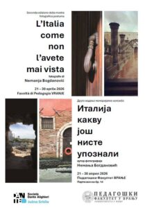 Удружење Данте Алигијери у Врању представиће друго издање постхумне изложбе фотографија архитекте Немање Богдановића, под називом „Италија какву никада нисте упознали“, изложбом фотографија и промоцијом