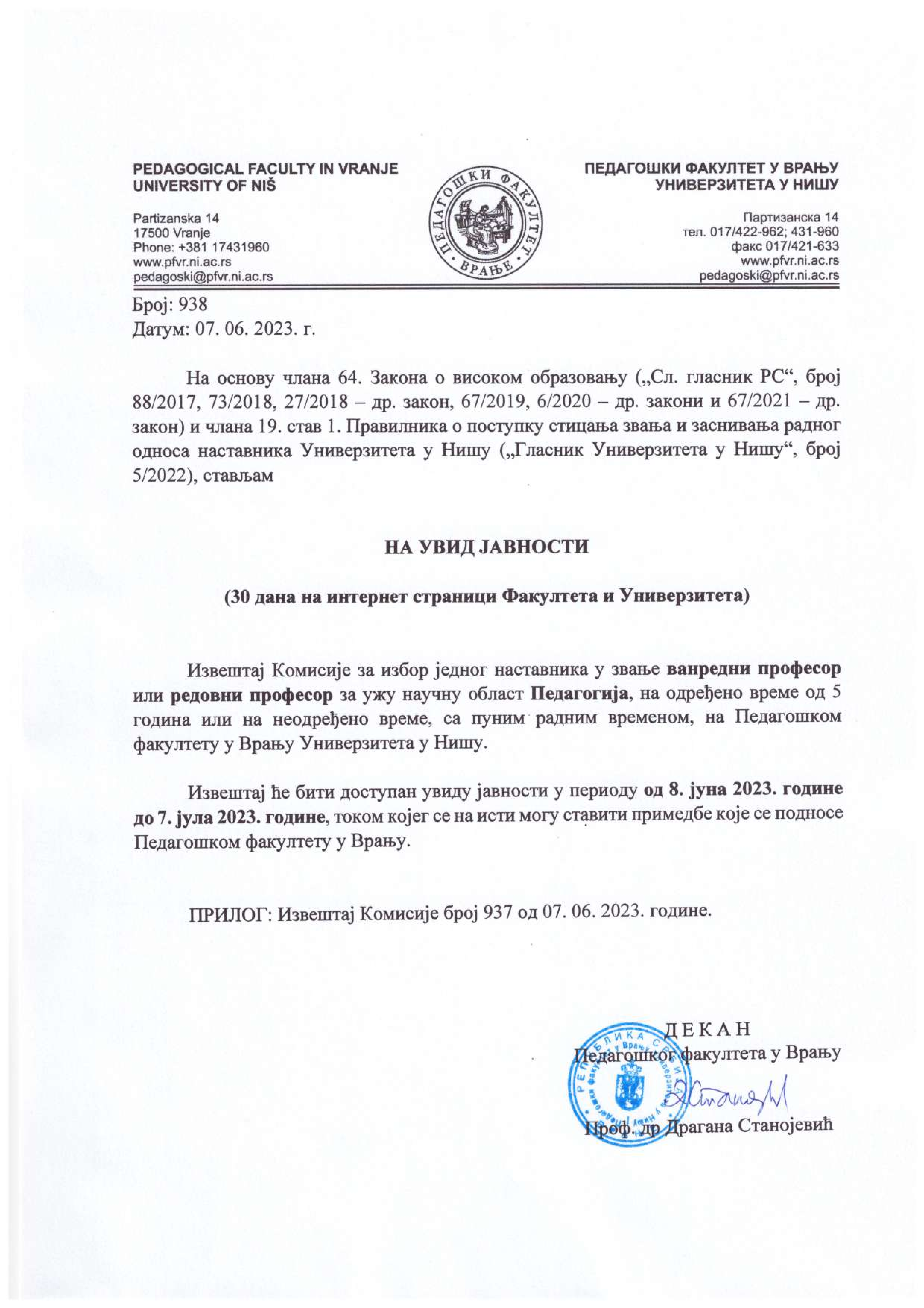 ИЗВЕШТАЈ КОМИСИЈЕ ЗА ИЗБОР ЈЕДНОГ НАСТАВНИКА У ЗВАЊЕ ВАНРЕДНИ ПРОФЕСОР ИЛИ РЕДОВНИ ПРОФЕСОР ЗА УЖУ НАУЧНУ ОБЛАСТ ПЕДАГОГИЈА, НА ОДРЕЂЕНО ВРЕМЕ ОД 5 ГОДИНА ИЛИ НА НЕОДРЕЂЕНО ВРЕМЕ, СА ПУНИМ РАДНИМ ВРЕМЕНОМ