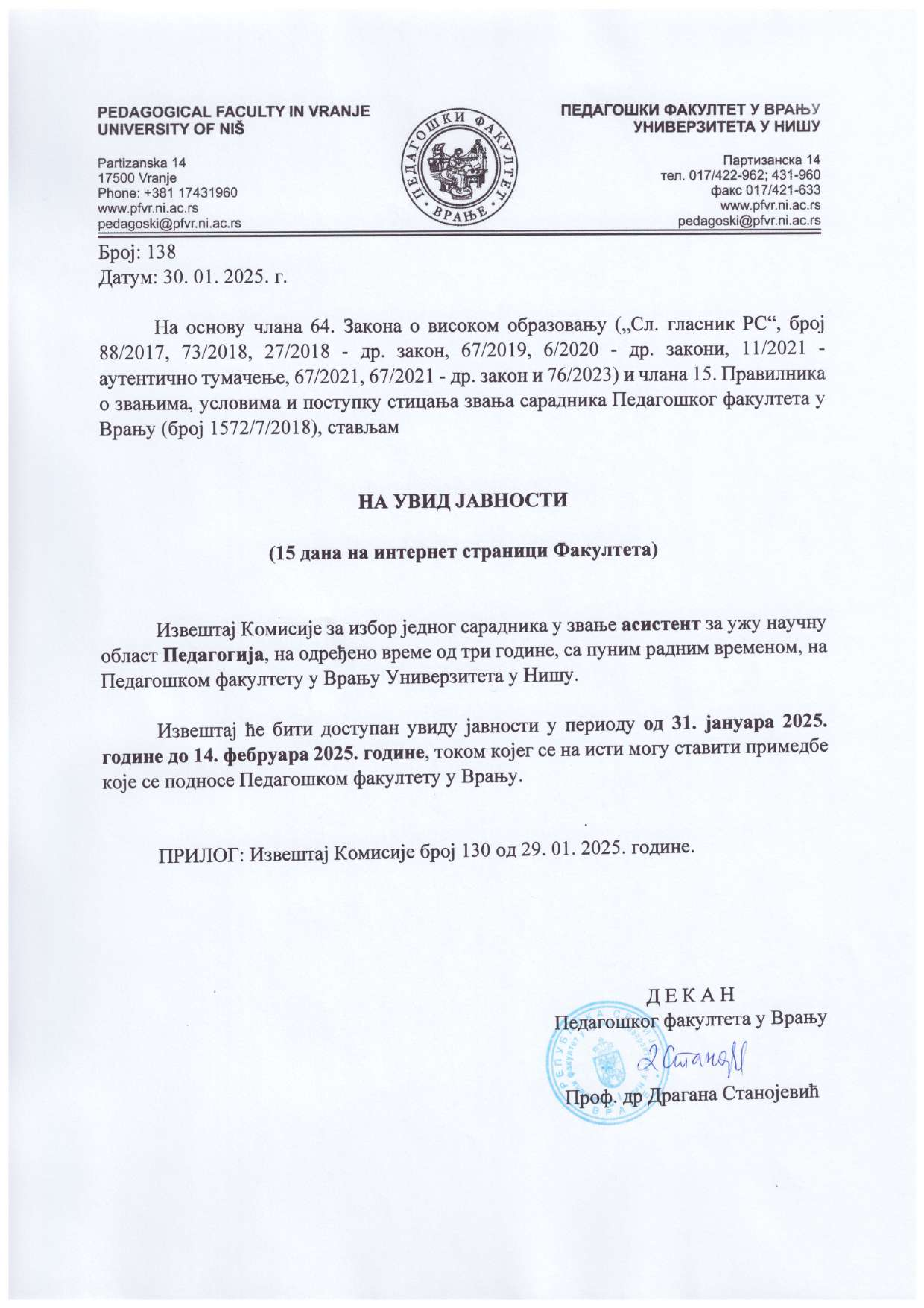 ИЗВЕШТАЈ КОМИСИЈЕ ЗА ИЗБОР ЈЕДНОГ САРАДНИКА У ЗВАЊЕ АСИСТЕНТ ЗА УЖУ НАУЧНУ ОБЛАСТ ПЕДАГОГИЈА, НА ОДРЕЂЕНО ВРЕМЕ ОД ТРИ ГОДИНЕ, СА ПУНИМ РАДНИМ ВРЕМЕНОМ