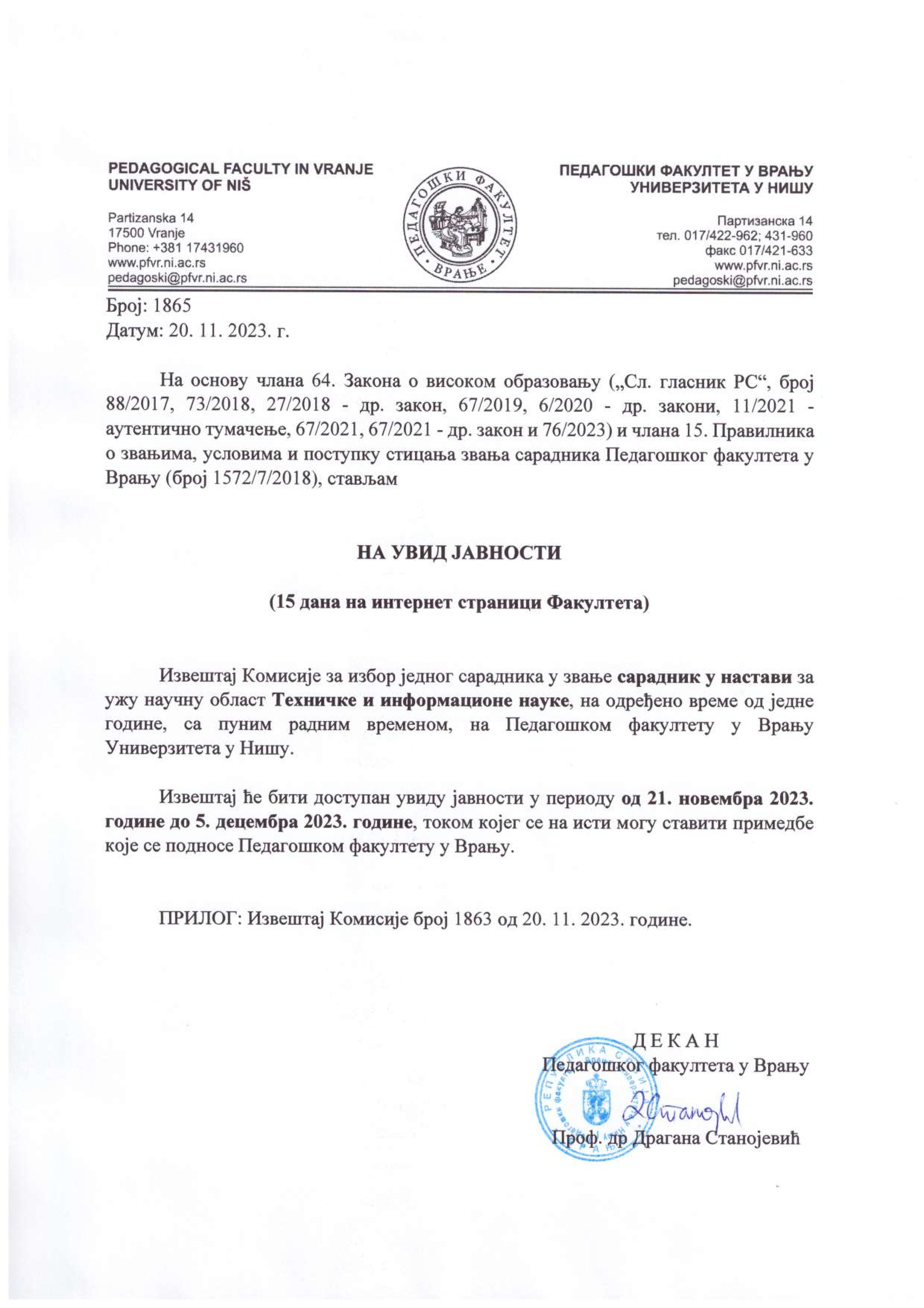 ИЗВЕШТАЈ КОМИСИЈЕ ЗА ИЗБОР ЈЕДНОГ САРАДНИКА У ЗВАЊЕ САРАДНИК У НАСТАВИ ЗА УЖУ НАУЧНУ ОБЛАСТ ТЕХНИЧКЕ И ИНФОРМАЦИОНЕ НАУКЕ, НА ОДРЕЂЕНО ВРЕМЕ ОД ЈЕДНЕ ГОДИНЕ, СА ПУНИМ РАДНИМ ВРЕМЕНОМ