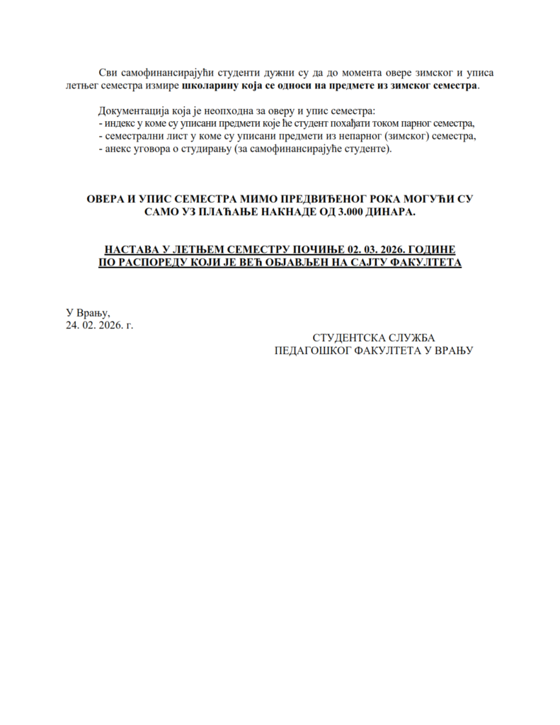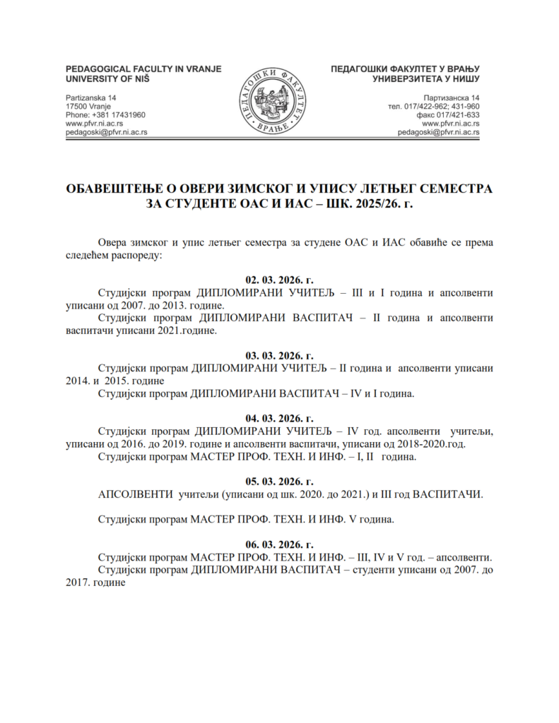 Igor Mitić 24. фебруар 2026. Обавештења, Огласна табла, Огласна табла - васпитач, Огласна табла - Неготин, Огласна табла - учитељ, Огласна табла ИАС ОБАВЕШТЕЊЕ О ОВЕРИ ЗИМСКОГ И УПИСУ ЛЕТЊЕГ СЕМЕСТРА ЗА СТУДЕНТЕ ОАС И ИАС – ШК. 2025/26. г. Анекс уговора о студирању Семестрални лист