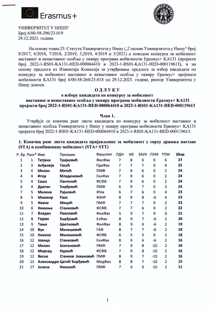 Igor Mitić 29. децембар 2023. Вести, Међународна сарадња Одлука о избору кандидата за мобилност по програму Еразмус+КА131