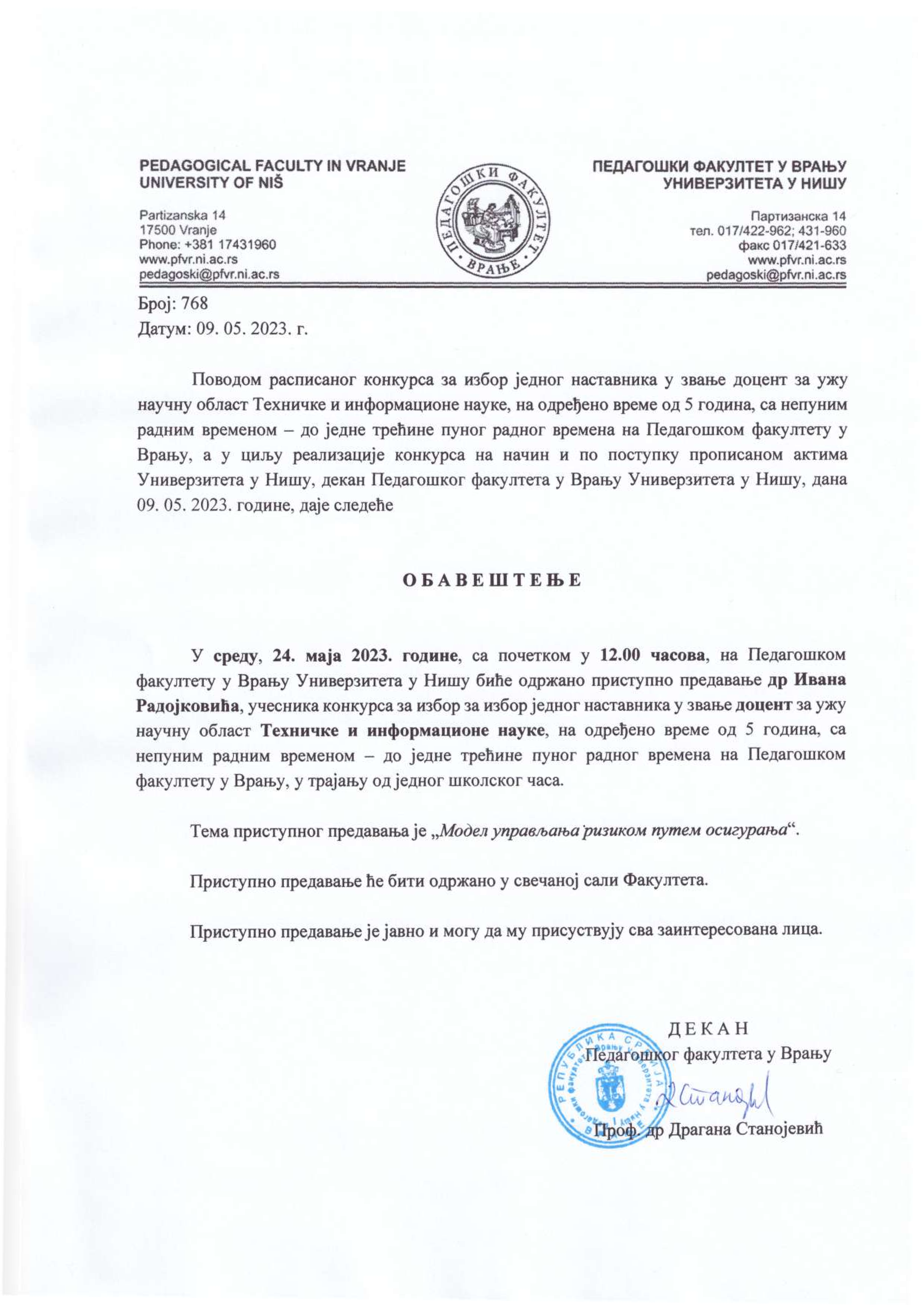 У среду, 24. маја 2023. године, са почетком у 12.00 часова, на Педагошком факултету у Врању Универзитета у Нишу биће одржано приступно предавање др Ивана Радојковића, учесника конкурса за избор за избор једног наставника у звање доцент за ужу научну област Техничке и информационе науке, на одређено време од 5 година, са непуним радним временом – до једне трећине пуног радног времена на Педагошком факултету у Врању, у трајању од једног школског часа.