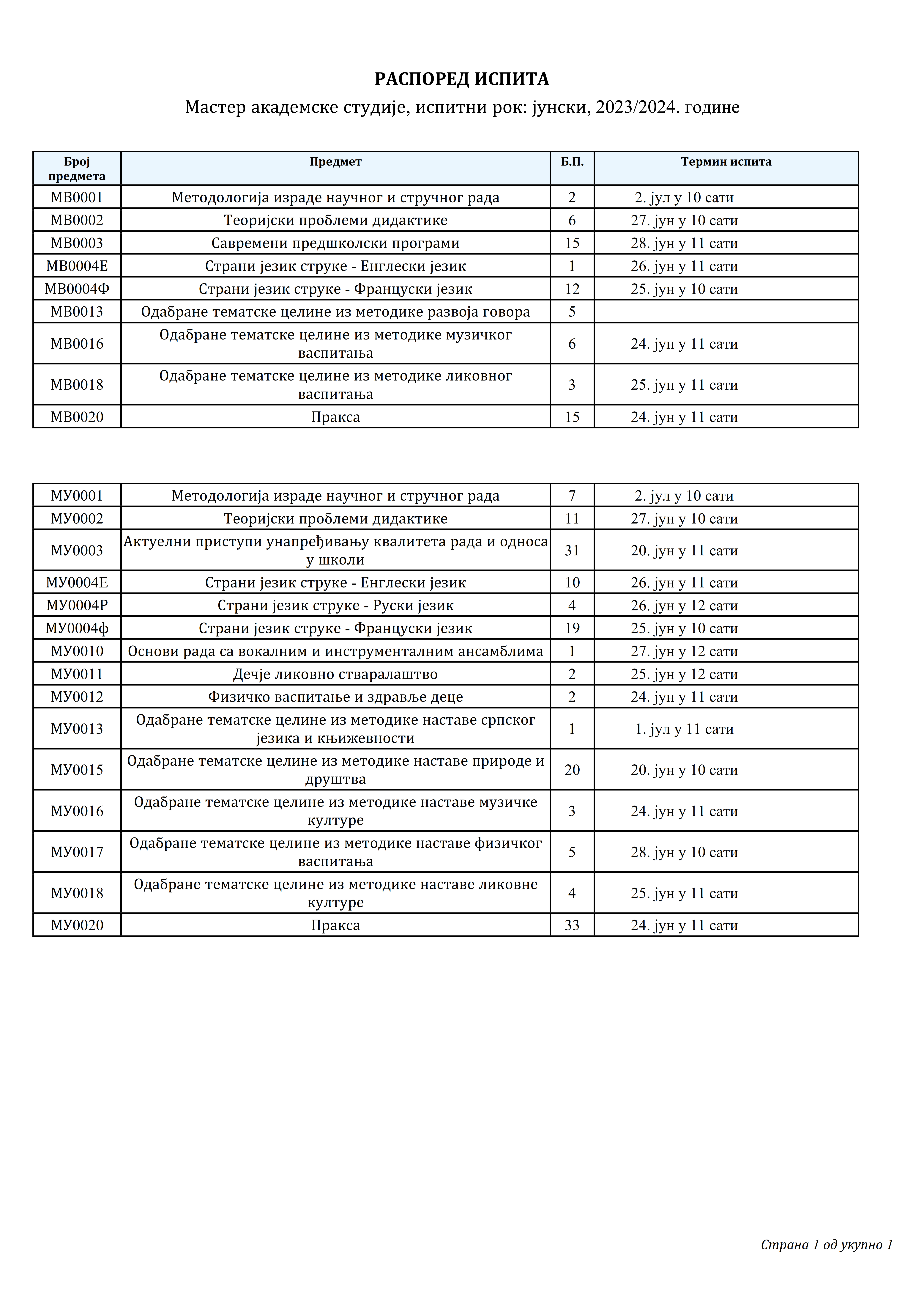 РАСПОРЕД ИСПИТА МАСТЕР АКАДЕМСКЕ СТУДИЈЕ – ЈУНСКИ ИСПИТНИ РОК