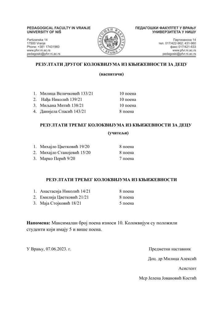 Igor Mitić 7. јун 2023. Огласна табла, Огласна табла - васпитач, Огласна табла - учитељ РЕЗУЛТАТИ ДРУГОГ И ТРЕЋЕГ КОЛОКВИЈУМА ИЗ КЊИЖЕВНОСТИ ЗА ДЕЦУ