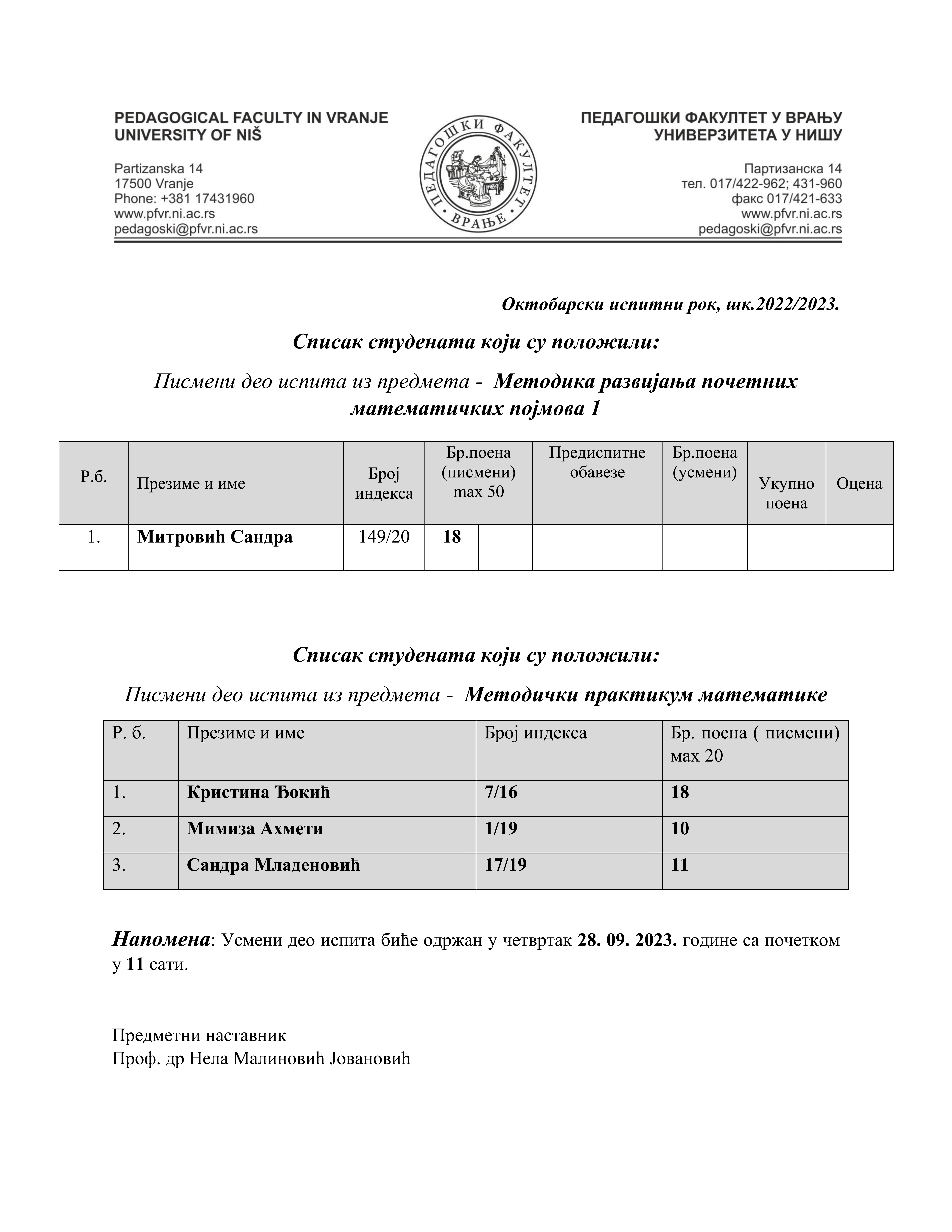 Igor Mitić 25. септембар 2023. Огласна табла, Огласна табла - васпитач, Огласна табла - учитељ, Огласна табла ИАС РЕЗУЛТАТИ ИСПИТА – ПРОФ. ДР НЕЛА МАЛИНОВИЋ ЈОВАНОВИЋ