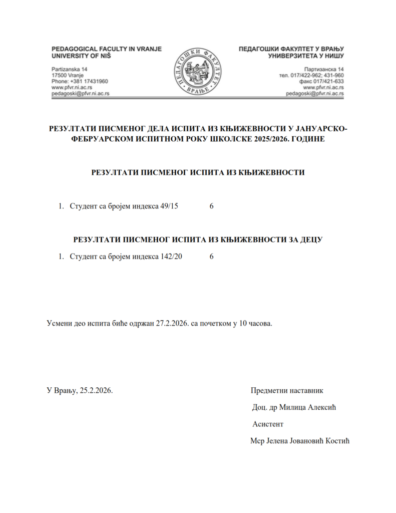 Igor Mitić 25. фебруар 2026. Oбавештења Неготин, Огласна табла - Неготин РЕЗУЛТАТИ ПИСМЕНОГ ДЕЛА ИСПИТА ИЗ КЊИЖЕВНОСТИ У ЈАНУАРСКО-ФЕБРУАРСКОМ ИСПИТНОМ РОКУ ШКОЛСКЕ 2025/2026. ГОДИНЕ