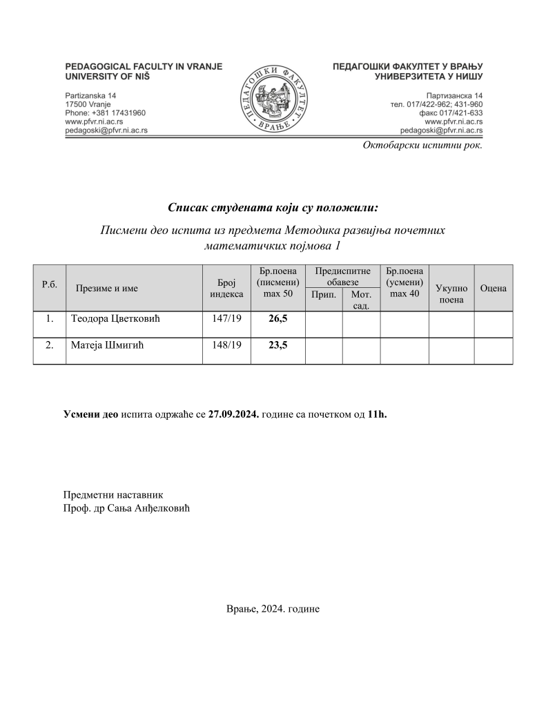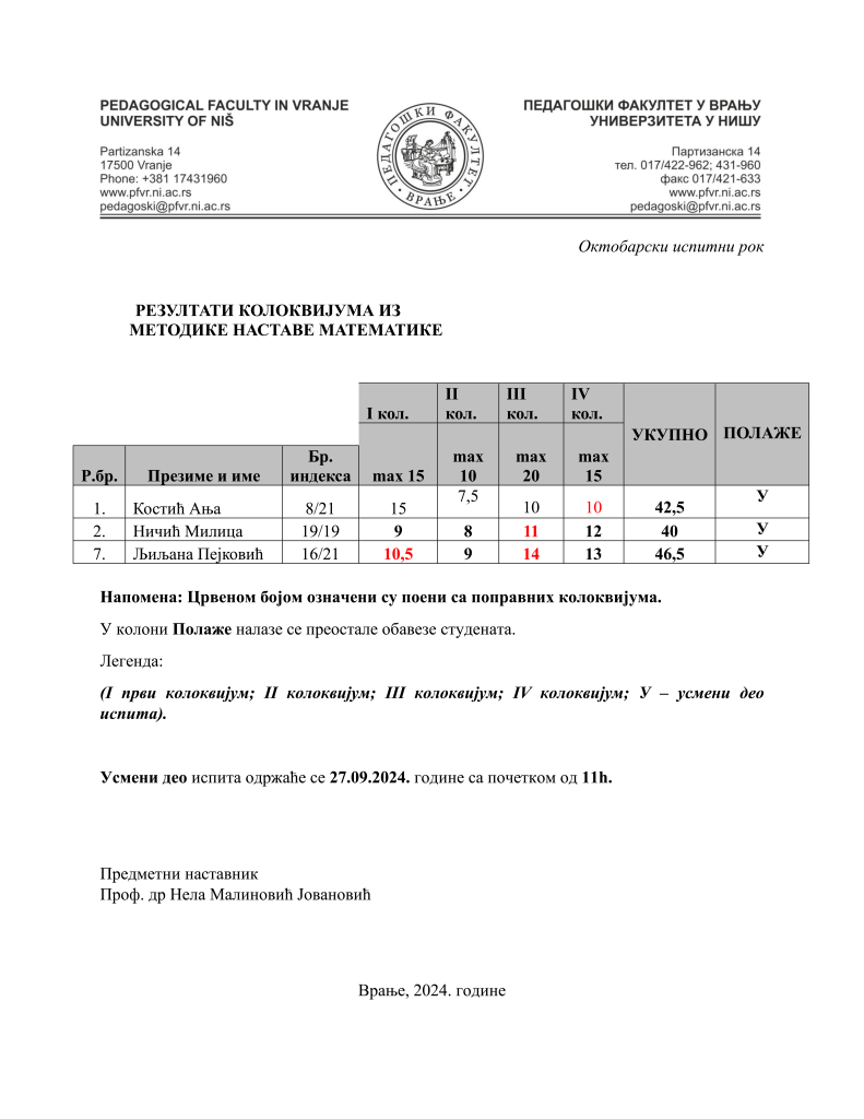 Igor Mitić 23. септембар 2024. Огласна табла, Огласна табла - васпитач, Огласна табла - учитељ РЕЗУЛТАТИ ПИСМЕНИХ ДЕЛОВА ИСПИТА И КОЛОКВИЈУМА, ПРОФ. ДР НЕЛА МАЛИНОВИЋ – ОКТОБАР 2024