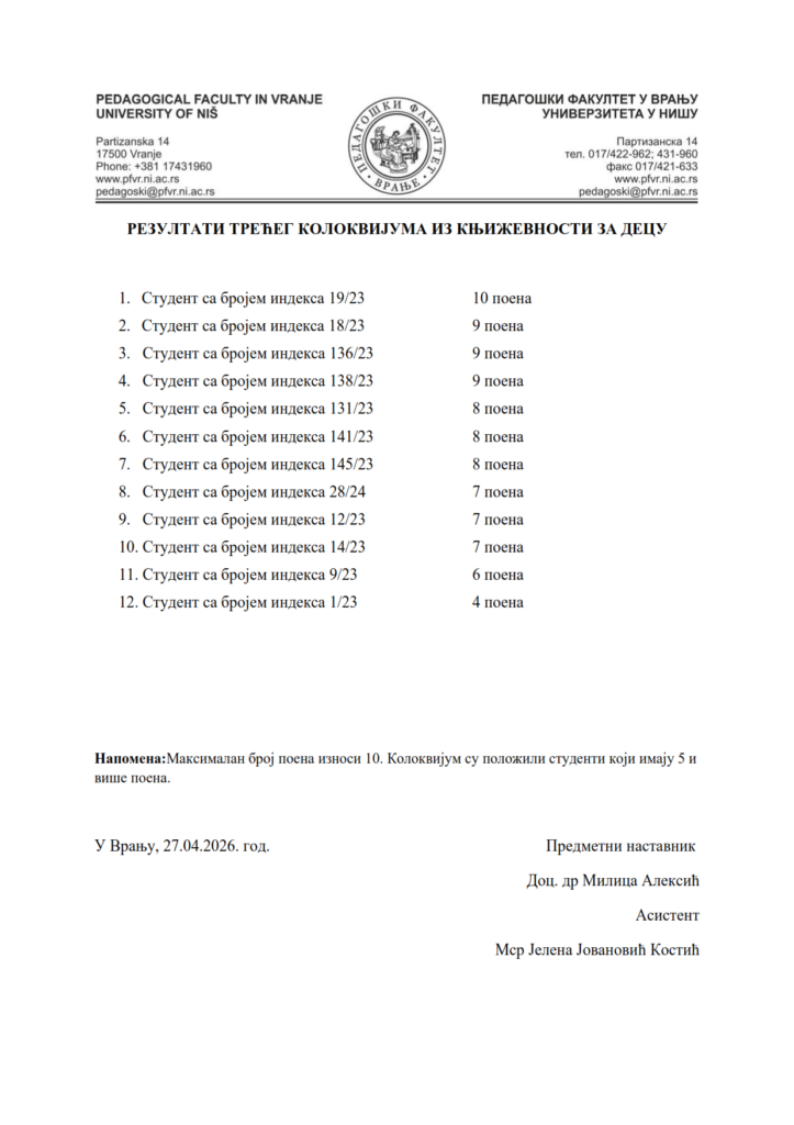 Igor Mitić 27. април 2026. Огласна табла, Огласна табла - учитељ РЕЗУЛТАТИ ТРЕЋЕГ КОЛОКВИЈУМА ИЗ КЊИЖЕВНОСТИ ЗА ДЕЦУ – април 2026.
